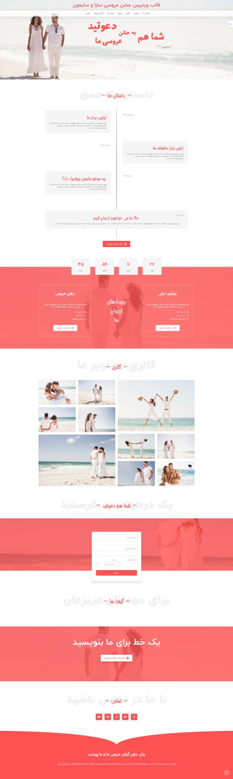 طراحی سایت عروسیاین وبسایت مخصوص مراسم عروسی ساخته شده تا عروس و داماد بتوانند بهترین لحظههای زندگیشان را در قالبی شیک، هماهنگ و کاملاً اختصاصی با مهمانان به اشتراک بگذارند. طراحی صفحات با حالوهوای مراسم، رنگبندی ظریف و جزئیات عاشقانه انجام میشود. بخشهای مختلفی مثل معرفی زوج، داستان آشنایی، گالری عکس و فیلم، شمارش معکوس تا روز مراسم، اطلاعات دقیق زمان و مکان، نقشه گوگل و حتی فرم حضور مهمانان در سایت قرار میگیرد.